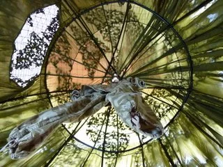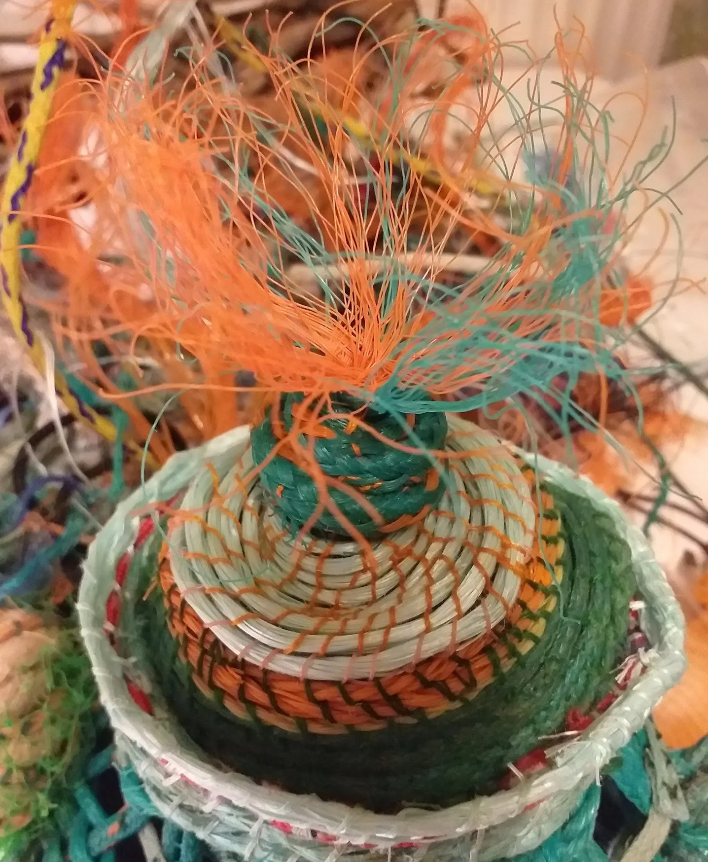 Basket and teapot made from ghostnet found on Llansteffan Beach